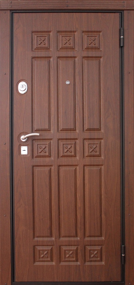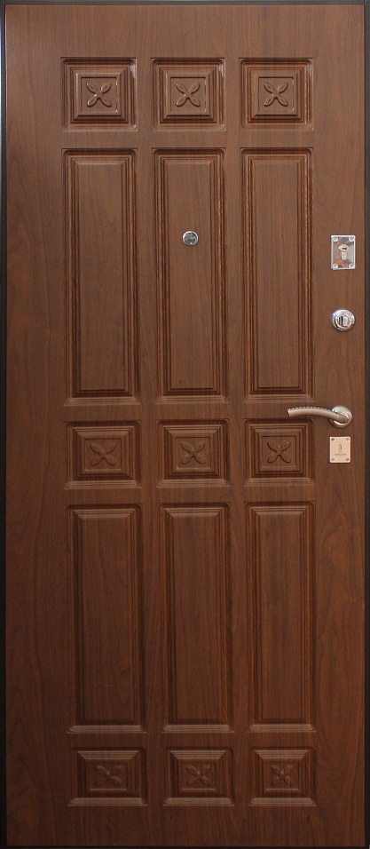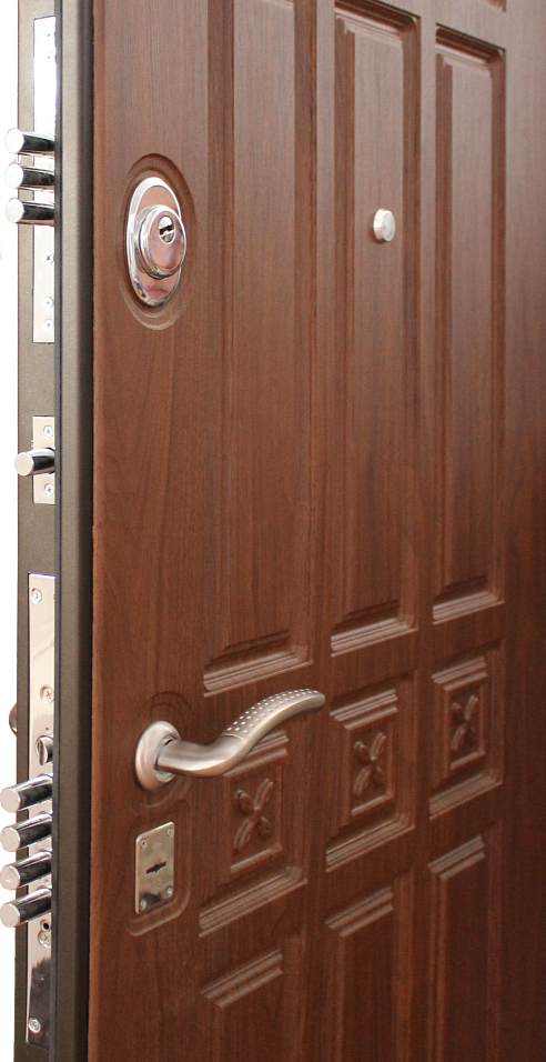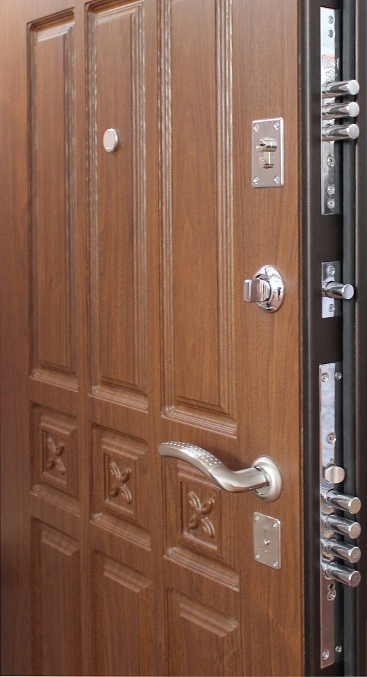 • Фурнитура: бронь на дополнительный замок, ручка, задвижка, глазок. Цвет - Хром.