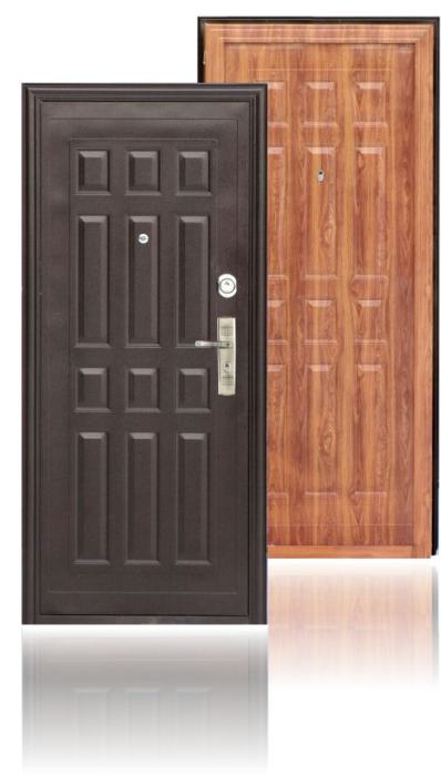 Комплектация: дверное полотно, короб, наличники, глазок, замок цилиндрический 13-ригельный перекодируемый, фурнитура (ручка-2шт., анкерные болты и заглушки-6 шт.), 4 скрытых регулируемых навеса.